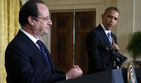 وأضاف أولاند، خلال مؤتمر صحفي مشترك مع الرئيس أوباما، أنه يجب تطبيق مسار انتقالي في سوريا يؤدي إلى رحيل الرئيس بشار الأسد، قائلًا: "قد نتعاون مع موسكو إن أراد الرئيس الروسي التركيز على ضرب داعش".