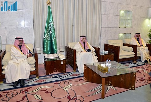 أحمد البراهيم- سبق- الرياض: في قصة مصورة رصدتها "سبق"، روت قوة الجسد الواحد وصدق التلاحم وعظيم الوفاء ومحبة الشعب والمواطنة، استقبل خادم الحرمين الشريفين الملك سلمان بن عبدالعزيز آل سعود وصاحب السمو الملكي الأمير مقرن بن عبدالعزيز آل سعود ولي العهد نائب رئيس مجلس الوزراء وصاحب السمو الملكي الأمير محمد بن نايف بن عبدالعزيز ولي ولي العهد النائب الثاني لرئيس مجلس الوزراء وزير الداخلية، بعد صلاة العشاء يوم الجمعة في قصر الحكم بالرياض، جمعاً من الأمراء والمفتي العام للسعودية والعلماء والوزراء وكبار المسؤولين من مدنيين وعسكريين وجموعاً غفيرة من المواطنين، الذين قدموا البيعة على كتاب الله وسُنة رسوله صلى الله عليه وسلم لخادم الحرمين الشريفين الملك سلمان بن عبدالعزيز آل سعود ملكاً للمملكة العربية السعودية، ولصاحب السمو الملكي الأمير مقرن بن عبدالعزيز آل سعود ولياً للعهد، ولصاحب السمو الملكي الأمير محمد بن نايف بن عبدالعزيز ولياً لولي العهد.