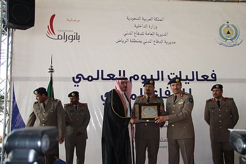 سبق-الرياض :رعى المدير العام للدفاع المدني الفريق سليمان بن عبدالله العمرو  صباح اليوم حفل تدشين فعاليات اليوم العالمي للدفاع المدني لعام 2015م، نيابة عن الأمير فيصل بن بندر بن عبدالعزيز أمير منطقة الرياض والتي أقيمت تحت شعار "تنمية مستدامة بلا مخاطر"، بمركز بانوراما مول التجاري بمدينة الرياض.