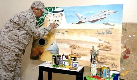 وجاءت اللوحة معبرة عن أحداث "عاصفة الحزم" التي نفذتها قوات التحالف الدولية بقيادة المملكة العربية السعودية.