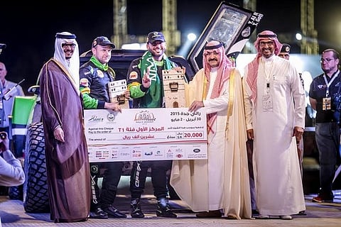 سبق- الرياض: حافظ بطل الراليات السعودية يزيد الراجحي على لقبه في النسخة الثانية من رالي جدة الصحراوي 2015، بعد أن حسم المركز الأول مع ملّاحه الألماني تيمو غوتشالك، على متن سيارته "هامر"، في ختام المرحلة الأخيرة التي أقيمت بين منطقتيْ "البريكه" و"خليص" بجدة.