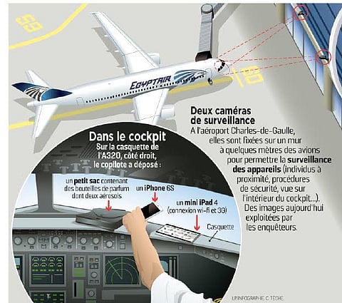 وحسب صحيفة "الحياة"، ذكرت صحيفة "لو باريزيان" الفرنسية، أن مصادر في لجنة التحقيق الفرنسية وجدت جهاز "آيفون 6 بلس" وحاسوباً لوحياً "ميني آيباد 4" وأربع زجاجات عطر موضوعة على المنصة المقابلة لمقعد مساعد الطيار في الجهة اليمنى من الطائرة، وأن "الحريق الذي اندلع في القمرة قد يكون ناتجاً عن ارتفاع حرارة بطارية الليثيوم في هاتف مساعد الطيار أو الجهاز اللوحي الخاص به"؛ مشيرة إلى أن "هذه الجهة بالتحديد تَسَبّبت في صدور الإنذار الأول عن نظام التنبيه التلقائي. وأضافت الصحيفة "أنه يجب الآن مواجهة هذه النتائج التي توصلت إليها لجنة التحقيق الفرنسية بما يسمى "وحدة البيئة"، مع التحقيقات الفنية التي تقوم بها السلطات المصرية".