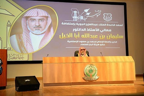 ألقى الأستاذ الدكتور سليمان أبا الخيل، مدير جامعة الإمام محمد بن سعود الإسلامية، ورئيس اتحاد الجامعات الإسلامية عضو هيئة كبار العلماء، بحضور قائد قاعدة الملك عبدالعزيز الجوية في الظهران الأمير تركي بن بندر بن عبدالعزيز، محاضرة لمنسوبي القاعدة، أكّد فيها عِظَم مسؤليتهم وأمانتهم وواجبهم تجاه حماية بلادنا ومقدساتنا ومكتسباتنا ومقدراتنا وولاة أمرهم، وأن ذلك معدود من الجهاد في سبيل الله، وأنه يجب ألا يلتفتوا إلى المُثبّطين والمتربصين والأعداء، وأن يقفوا صفاً واحداً قوياً متراصاً مع ولاة الأمر وبحزم وقوة.