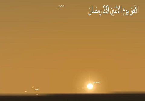 وأضاف: كما أن الشمس تشرق وتغرب، فالقمر أيضًا يشرق ويغرب، ولكنه لا يشرق دائمًا ليلاً، ويغرب نهارًا كما يعتقد الكثيرون! فالقمر يشرق كل يوم في موعد يعتمد على طوره؛ فعندما يكون القمر محاقًا فإنه يشرق مع الشمس ويغيب معها تقريبًا، وعندما يكون تربيعًا أولاً فإنه يشرق عند منتصف النهار ويغيب عند منتصف الليل تقريبًا، أما عندما يكون بدرًا فإنه يشرق مع غروب الشمس ويغرب مع شروق الشمس، وعندما يكون هلالاً جديدًا فإنه يشرق بعد شروق الشمس بقليل ويغرب بعد غروب الشمس بقليل. ولرؤية هلال الشهر الجديد في السماء فإننا نقوم بتحري الهلال في اليوم التاسع والعشرين، ولا بد من توفر شرطين أساسيين تستحيل رؤية الهلال بغياب أحدهما: