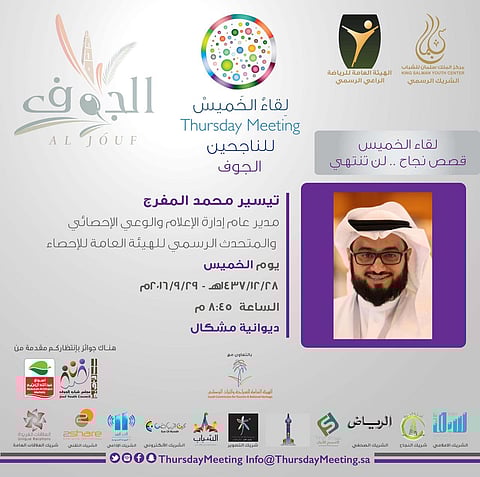 يحلّ مدير عام إدارة الإعلام والوعي الإحصائي والمتحدث الرسمي للهيئة العامة للإحصاء تيسير بن محمد المفرج، ضيفاً لدى شباب منطقة الجوف في برنامج "لقاء الخميس" للناجحين، والذي ترعاه "سبق" إعلامياً؛ للحديث عن مشواره الإعلامي في وزارة العمل وكذلك "الإحصاء".