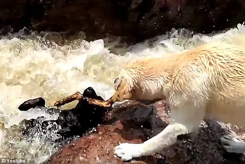 وحسب الفيديو، ظهر كلب أصفر اللون على صخور المنحدر وهو يراقب الواقعة، وبسرعة مدّ الكلب الأصفر فمه، وقبض على العصا وجذبها بفكيه ومعها الكلب الأسود، حتى أنقذه من المياه المنحدرة، ووضعه فوق الصخور.