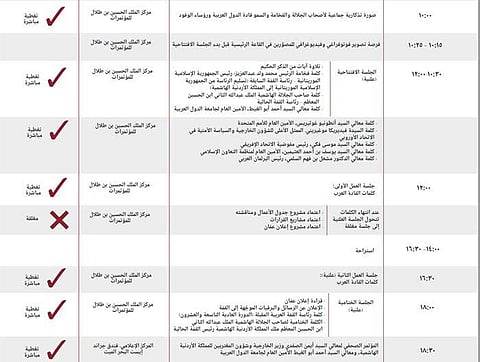 نشرت صحيفة "الغد" الأردنية، صباح اليوم، البرنامج الإعلامي لاجتماع مجلس جامعة الدول العربية على مستوى القمة في دورتها الثامنة والعشرين، التي تُعقد صباح اليوم، في مركز الملك الحسين بن طلال للمؤتمرات في البحر الميت، إذ سيلقي العاهل الأردني خطاباً في الجلسة الافتتاحية يرحب فيه بالزعماء والقادة العرب.