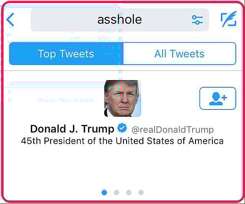 اقتنص أحد مراسلي موقع "بز فيد" ملاحظة تتمثل في كون نتائج البحث عن كلمات مثل عنصري، متعصب، فاشي أو أحمق في تويتر.. تُظهر الرئيس الأمريكي دونالد ترمب كنتيجة أولى، فقد نشر الصحافي Sam Styker تغريدة موثقة بأربع صور تورد أمثلة على عملية بحث عن الكلمات المشار إليها.