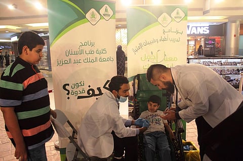ولفتت إلى أن فريق العمل المشارك الذي ضم إلى جانب أطباء وطبيبات الامتياز، المشرفين والباحثين والمنسقين أسهم عبر ركن التثقيف والمشورة العامة في تقديم خدمة الفحص السريري المباشر في المراكز التجارية، حيث إنه في حال وجود حالة طارئة تستدعي التدخل الإكلينيكي يعطى للمريض إحالة لمراجعة عيادات مستشفى الأسنان الجامعي، كما تم استخدام الشاشات التلفزيونية لاستعراض الرسائل التوضيحية لكيفية تنظيف الأسنان بطريقة سليمة والعناية بصحة الفم والأسنان وتوزيع المطويات التثقيفية والتعليمية للزوار.