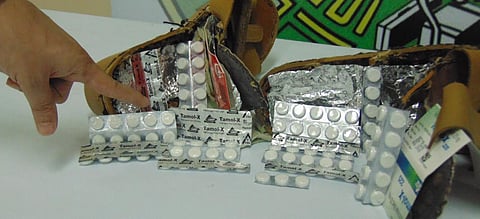 وأضاف: "بعد إزالة الطبقة الجلدية بقاعدة الحذاء تَبَيّن أنها تحتوي على 12 شريطاً؛ كل شريط يحتوي على عشر حبات وحبة واحدة فقط بيضاء اللون تحمل اسم "ترامادول"؛ ليصبح العدد الإجمالي (121) حبة".