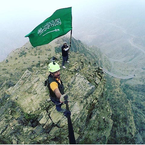 رفع شابان سعوديان علم المملكة العربية السعودية وصور ولاة الأمر عالياً يوم أمس، بأعلى قمم الجبال في الباحة، بعد رحلة استغرقت أكثر من 14 ساعة من المشي على الأقدام.