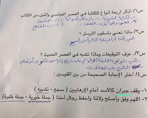 وكتب معلّم مادة في اللغة العربية سؤالاً اختياريا للطلاب قال فيه "وقَف جبران كالأسد أمام الإرهابيين (سجع -تشبيه)"؛ فيما أظهرت صورة ورقة الإجابة اختيار الطالب وصف "تشبيه" وهي الإجابة الصحيحة.