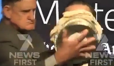 تلقى الرئيس التنفيذي لشركة طيران "كانتاس" الأسترالية آلان جويس، اليوم الثلاثاء، كعكة ليمون على وجهه من قِبَل رجل مسنّ خلال إلقاء كلمة في مؤتمر صحفي بفندق حياة ريجنسي في مدينة بيرث.
