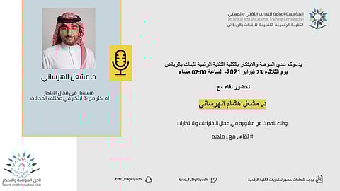 يستضيف نادي الموهبة والابتكار بالكلية الرقمية التقنية للبنات بالرياض التابعة للمؤسسة العامة للتدريب التقني والمهني؛ الحلقة الثانية من سلسلة ”لقاء مع ملهم” والتي تهدف لاستضافة مبتكرين وموهوبين في مختلف المجالات ليستفيد المتدربات من هذه التجارب ويتغلبوا على جميع التحديات التي تواجههم خلال مرحلة التدريب.