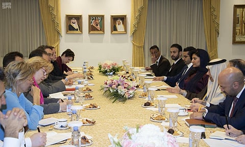 حضر اللقاء، الأميرة ريما بنت بندر بن سلطان بن عبدالعزيز؛ سفيرة خادم الحرمين الشريفين لدى الولايات المتحدة الأمريكية.
