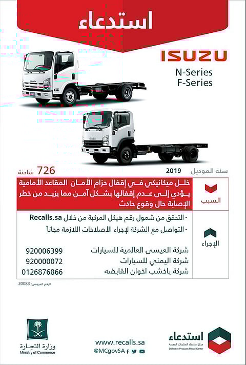 أعلنت وزارة التجارة، اليوم، استدعاء 726 شاحنة إيسوزو "N-Series / F-Series" موديل 2019 لخلل ميكانيكي في إقفال حزام الأمان للمقاعد الأمامية يؤدي إلى عدم إقفالها بشكل آمن مما يزيد من خطر الإصابة حال وقوع حادث.