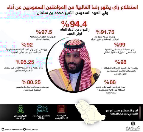وبيَّن الاستطلاع الذي أجراه مركز "سمت" للدراسات الذي يتخذ من الرياض مقراً له، أن 94.4% من المستطلع آراؤهم في مختلف مناطق المملكة، راضون عن أداء ولي العهد، ويرون في ذلك أثرًا من خلال حدوث تحسن "بدرجة كبيرة" في الأداء العام السياسي والاقتصادي والاجتماعي، وذلك بعد خمسة أشهر من توليه للمنصب، وهو أداء يُمكِّنه -وفق الاستطلاع- من بناء مستقبل أفضل للمملكة، على اعتباره عرَّابًا لأغلب المشاريع الإصلاحية الجديدة.