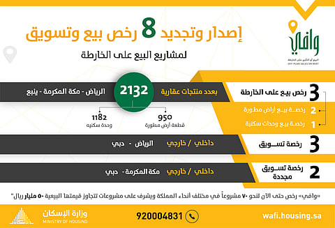 أصدرت لجنة البيع والتأجير على الخارطة "وافي" مؤخراً، ثلاث رخص بيع على الخارطة، وثلاث رخص أخرى لتسويق مشاريع داخل المملكة وخارجها، إضافة إلى تجديد رخصتي تسويق لمشروعات عقارية بنظام البيع على الخارطة.