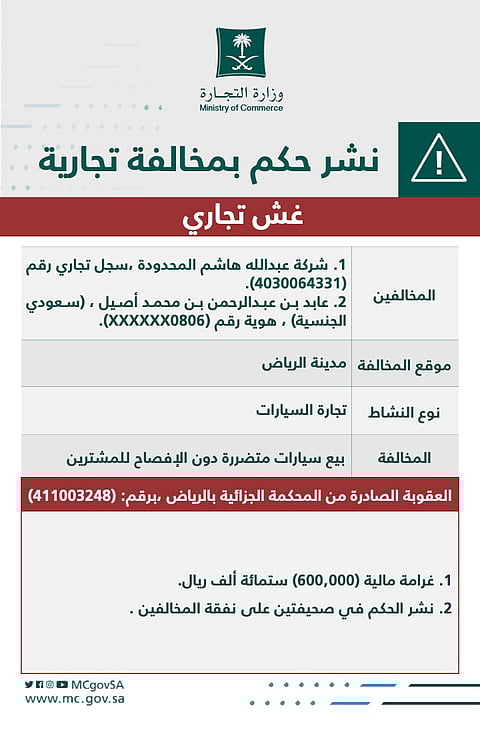شهرت وزارة التجارة بشركة سيارات وممثلها بعد صدور حكم قضائي نهائي بإدانتهما بمخالفة نظام مكافحة الغش التجاري، إثر ثبوت تورط الشركة في بيع 6 مركبات متضررة دون الإفصاح بعيوبها للمشترين، وهو مما يعد غشاً وتضليلاً للمستهلك.