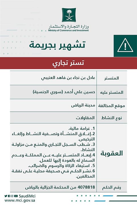 شهرت وزارة التجارة والاستثمار بمواطن ووافد من جنسية سورية، وذلك بعد صدور حكم قضائي بإدانتهما بجريمة التستر التجاري وثبوت تورط المواطن في تمكين الوافد من مزاولة النشاط التجاري باستخدام سجل مؤسسته التجارية والعمل لحسابه الخاص في نشاط المقاولات بمدينة الرياض، حيث تمت إحالة المتورطين إلى القضاء لتطبيق العقوبات النظامية بحقهما وفقاً لنظام مكافحة التستر.