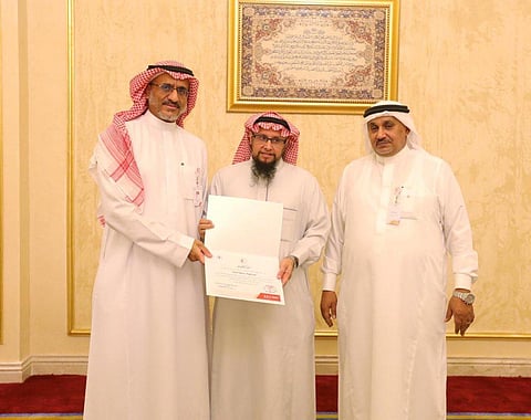 كرم رئيس هيئة الهلال الأحمر السعودي، الدكتور محمد عبد الله القاسم، رئيس فرع الهيئة بمنطقة الباحة، أثناء احتفال تكريم الهيئة، لأبطال الميدان بحج 1440هـ.