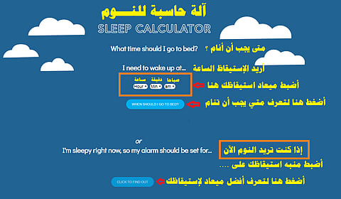 ويطرح الموقع عليك السؤال "متي يجب أن أنام؟ - What time should I go to bed?"، ثم يطلب منك الموقع تحديد وقت استيقاظك، وبعد تحديد وقت الاستيقاظ بالساعة والدقيقة في الصباح أو المساء، تضغط على مربع حوار، لتخرج لك أفضل مواعيد النوم؛ حيث يمنحك الموقع حوالي أربعة مواعيد.