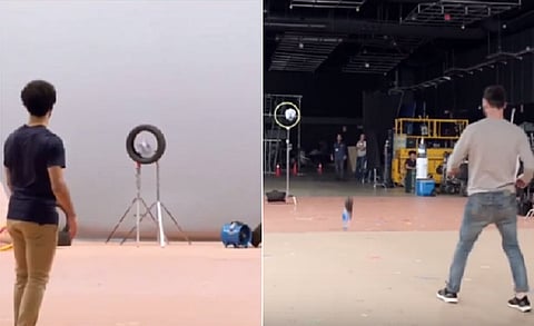 وفي الشريط، وضع أسطورة برشلونة الإسباني قنينة فوق الكرة وسدّد بقوة؛ لتستقر الكرة في حلقة صغيرة على مسافة بعيدة، بينما طارت القنينة في الهواء ثم استقرت على الوضع الصحيح.