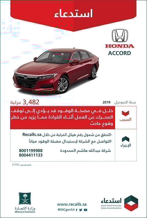 أعلنت وزارة التجارة عن استدعاء 5.256 مركبة هوندا "ACCORD / CIVIC / HR-V / PILOT / CR-V / CITY / ODYSSEY" 2019 – 2020؛ لخلل في مضخة الوقود، قد يؤدي إلى توقف المحرك عن العمل أثناء القيادة مما يزيد من خطر وقوع حادث.