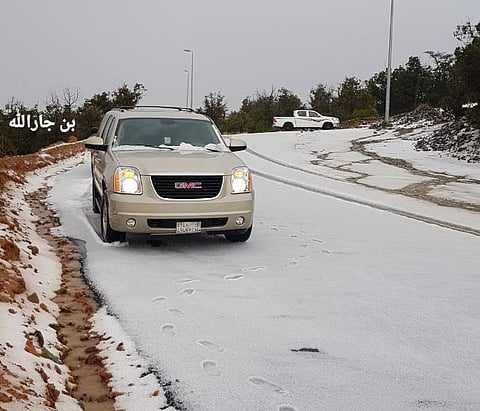 ووثق المصور جارالله الشهري عصر اليوم الثلاثاء الحالة الجوية النادرة التي تشهدها المنطقة من تساقط للبرد تزامنا مع هطول الأمطار الغزيرة التي شكلت شلالات مائية، تنساب بين كتل البرد الكثيف.