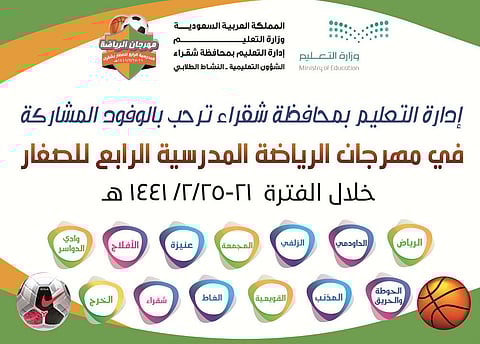 تستضيف إدارة التعليم في محافظة شقراء، اليوم الأحد، مهرجان الرياضة المدرسية الرابع للصغار في كرة القدم وكرة السلة، والذي يستمر لمدة ٥ أيام.