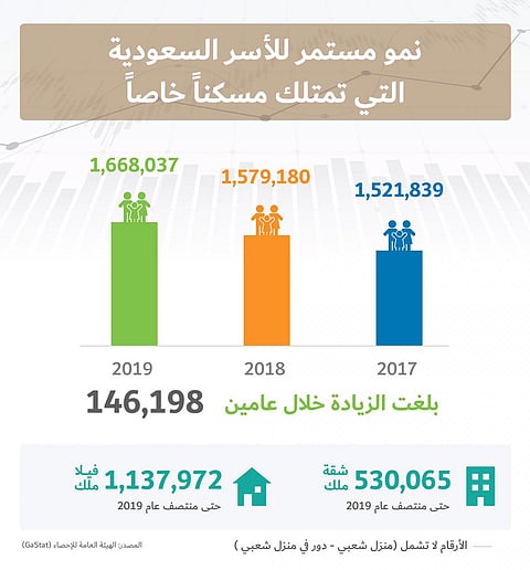 وتمكنت 146.198 أسرة سعودية من تملك مسكنها الأول وذلك خلال عامين، إذ تشير أرقام التملك السكني للسعوديين في عام 2017 إلى 1.521.839 أسرة، قبل أن يرتفع العدد إلى 1.668.037 في 2019، يشمل ذلك الشقق السكنية والفلل، مع استبعاد المساكن الشعبية والأدوار في البيوت الشعبية، والمباني غير المسلحة بشكل كامل.