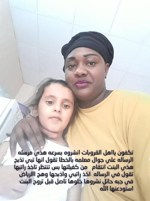 كفيل العاملة أشار لـ"سبق" بأنهم فوجئوا اليوم بصورة لعاملتهم التنزانية مع ابنتهم، وكُتب عليها عبارات مضمونها أن الرسالة وصلت لجوال معلمة بالخطأ، وأنها بثتها عبر التواصل الاجتماعي لعلها تصل لعائلة العاملة ووصلت لنا عن طريق التداول.
