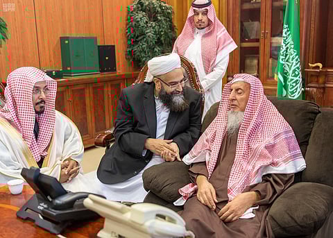 استقبل المفتي العام للمملكة رئيس هيئة كبار العلماء الرئيس العام للبحوث العلمية والإفتاء الشيخ عبدالعزيز بن عبدالله آل الشيخ في مكتبه بمقر الرئاسة اليوم رئيس مجلس علماء باكستان الشيخ حافظ محمد طاهر أشرفي والوفد المرافق له الذي يزور المملكة حاليًا.