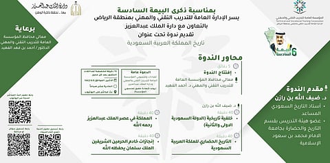 وأكد مدير عام الإدارة العامة للتدريب التقني والمهني بمنطقة الرياض عبدالرحمن المقبل أن هذه الندوة تأتي ضمن الفعاليات المصاحبة لذكرى البيعة السادسة لتولي خادم الحرمين الشريفين الملك سلمان بن عبدالعزيز يحفظه الله مقاليد الحكم ملكًا للمملكة العربية السعودية لإلقاء الضوء على تاريخ وحضارة هذه البلاد المباركة.