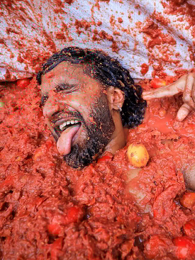 أحد المحتفلين يسبح في صلصة الطماطم خلال مهرجان "لا توماتينا" في قرية بونول الإسبانية