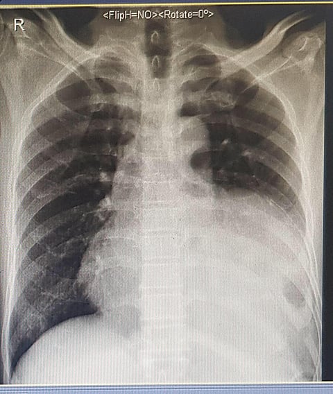 وأظهرت الكشوفات والأشعة أن المريض يعاني من فتق بعضلة الحجاب الحاجز من الجهة اليسرى، وأن جزءًا كبيرًا من الأمعاء دخلت في تجويف الصدر؛ مما سبب له انسدادًا معويًّا وقصورًا في التنفس بالرئة اليسرى.