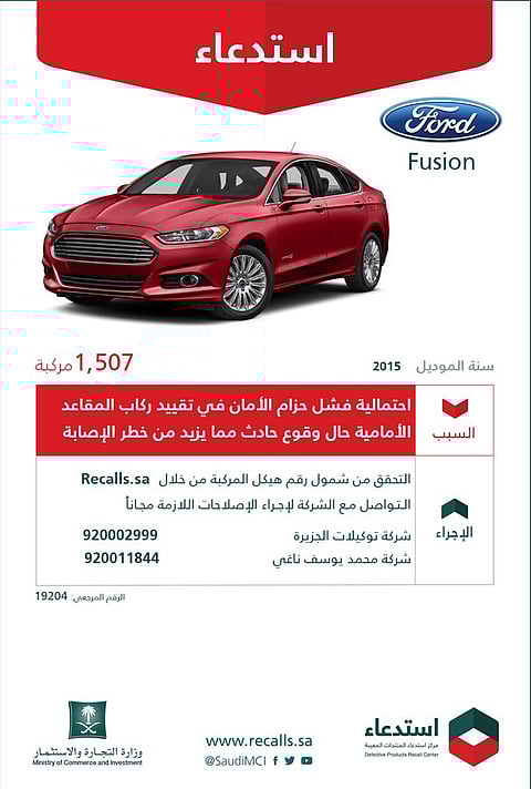 أعلنت وزارة التجارة والاستثمار، استدعاء 1507 مركبات "فورد- فيوجن" 2015.