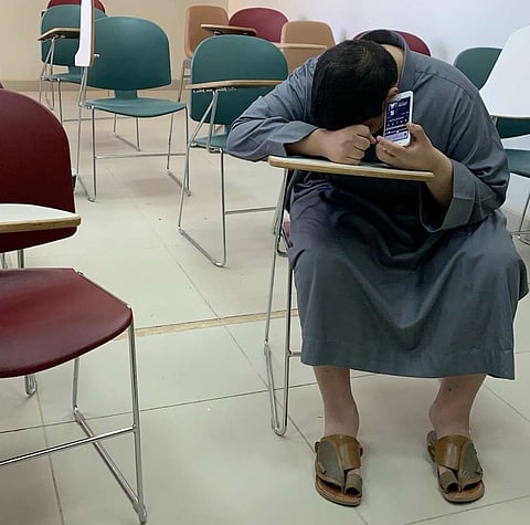 وكتب أستاذه حينذاك مرفقًا صورة له: "أتيت للقاعة باكرًا هذا الصباح وإذ بهذا الشاب الذي فقد بصره ولم يفقد بصيرته يأتي للقاعة قبل موعد المحاضرة بنصف ساعة؛ يستمع لتسجل محاضرات سابقة لمراجعتها. أمطروه بدعواتكم".