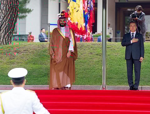 استقبل الرئيس مون جاي إن رئيس جمهورية كوريا اليوم في القصر الأزرق الرئاسي في العاصمة سيول صاحب السمو الملكي الأمير محمد بن سلمان بن عبدالعزيز ولي العهد نائب رئيس مجلس الوزراء وزير الدفاع .