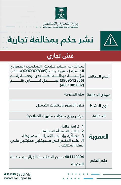 شهرت وزارة التجارة والاستثمار بصاحب مؤسسة تختص في تجارة العطور ومنتجات التجميل بمكة المكرمة؛ وذلك إثر ثبوت مخالفة نظام مكافحة الغش التجاري؛ بعرض وبيع معطرات وكريمات وزيوت للجسم ومستحضرات تجميل منتهية الصلاحية.