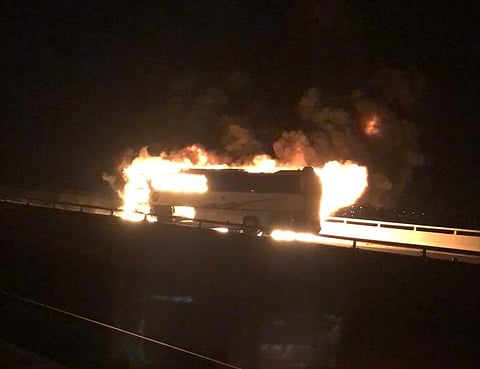 اشتعلت النيران بحافلة تقلُّ معتمرين من جنسيات مختلفة إثر تصادمها بمركبة
