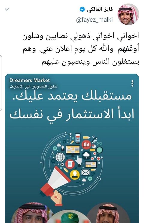جاء ذلك عبر تغريدة نشرها "المالكي"، وعبّر خلالها عن مدى استيائه من الشركة التي تستغل اسمه؛ محذرًا متابعيه من الوقوع في الخدعة؛ مشيرًا إلى أنهم يقومون بعمليات نصب، طالبًا المساعدة في إيقافهم.