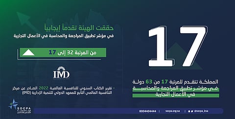 حققت الهيئة السعودية للمراجعين والمحاسبين تقدمًا إيجابيًّا في تقرير الكتاب السنوي للتنافسية العالمية 2022 الصادر عن مركز التنافسية العالمي التابع للمعهد الدولي للتنمية الإدارية "IMD"، في مؤشر تطبيق المراجعة والمحاسبة في الأعمال التجارية من المرتبة 32 إلى 17، معلنة تقدمها في 15 مرتبة، كما تقدمت المملكة العربية السعودية 8 مراتب عن العام الماضي لتحل في المرتبة الـ24 من بين 63 دولة هي الأكثر تنافسية في العالم.