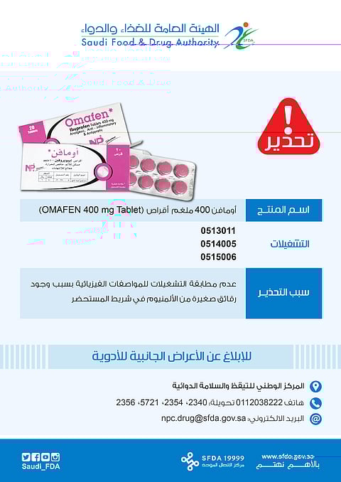 حذرت الهيئة العامة للغذاء والدواء، المستهلكين من استخدام التشغيلات التالية: (0513011-0514005-0515006) لمستحضر أومافن 400 ملغم أقراص (OMAFEN 400 mg Tablet) التابع للشركة الوطنية للصناعات الدوائية بسلطنة عمان، وذلك لعدم مطابقة تلك التشغيلات للمواصفات الفيزيائية بسبب وجود رقائق صغيرة من الألمنيوم في شريط المستحضر.