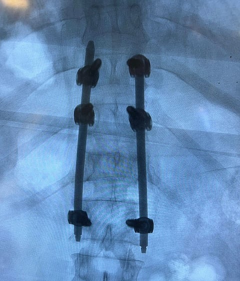 وفي العملية الأخرى، قام فريق طبي بالمجمع بتثبيت كسر غير مستقر بالفقرة الثانية عشرة، لرجل يبلغ من العمر 63 عاماً، حيث أصيب بعد تعرضه للسقوط، وتسبب ذلك في تعرضه للكسر مع تحدّب بزاوية 20.9.