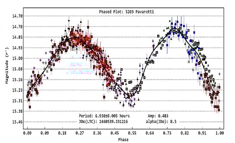 وأوضح المهندس محمد شوكت عودة؛ مدير مركز الفلك الدولي، في بيانٍ أوردهُ لـ "سبق": من الكويكبات التي تمَّ رصدُها الكويكب (5203 PAVAROTTI) الذي وجد أنه يدور حول نفسه مرة كل 6.93 ساعة، والكويكب (2032 Ethel) الذي يدور حول نفسه مرة كل 48.2 ساعة، والكويكب (4510 Shawna) الذي يدور حول نفسه مرة كل 47.93 ساعة والكويكب (2821 Slavka) الذي يدور حول نفسه مرة كل 202.5 ساعة، والكويكب (1987 UP2) الذي يدور حول نفسه مرة كل 600.4 ساعة.