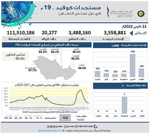 وقال مركز الإحصاء الخليجي عبر حسابه في تويتر: إن إجمالي اللقاحات المعطاة بدول التعاون بلغ 111,510,186 جرعة، وبلغت الإصابات المؤكّدة 3,558,881 حالة، وإجمالي حالات التعافي 3,488,160 حالة، وإجمالي حالات الوفاة بلغ 20277 حالة حتى يوم أمس.