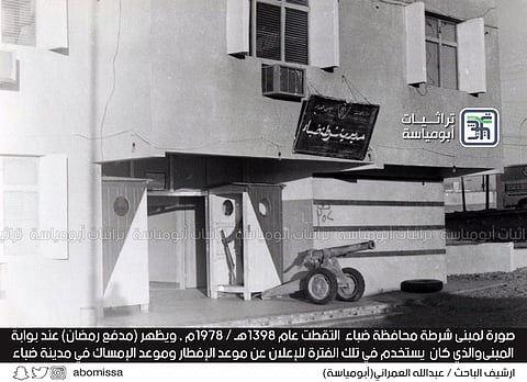 وحصلت "سبق" على صورة قديمة للمدفع الرمضاني في محافظة ضباء من أرشيف الباحث عبد الله العمراني، الذي تحدث عن الصورة فقال: "هذه الصورة توضح مبنى مديرية الشرطة في محافظة ضباء عام 1398هـ / 1978م، ويظهر أمام المبنى المدفع الرمضاني الذي كان من مسؤوليات الشرطة في ذلك الوقت، فكانت الدولة ـ حفظها الله ـ تهتم بهذا الجانب، وتم صرف مدفع لكل مديرية شرطة في المدن والمحافظات، ويتم سحبه إلى مكان مرتفع ومشرف على المحافظة؛ ليتم إطلاق المدفع إعلانًا لدخول رمضان والعيد، والإمساك في رمضان، والإفطار عند الغروب.