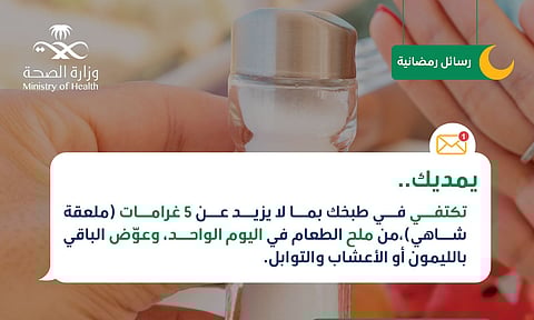 تفصيلاً، ذكر حساب "عش بصحة" على "إكس": يمديك.. تكتفي في طبخك بما لا يزيد عن 5 جرامات (ملعقة شاهي) من ملح الطعام في اليوم الواحد، وعوّض الباقي بالليمون أو الأعشاب والتوابل.