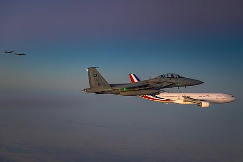 وعلَّق "الجلعود" على المنشور عبر حسابه في منصة "إكس" قائلاً: "طائرات (إف-15 إس آي) تابعة للقوات الجوية الملكية السعودية مرافقة للطائرة المقلة لفخامة الرئيس الفرنسي منذ دخولها الأجواء السعودية".